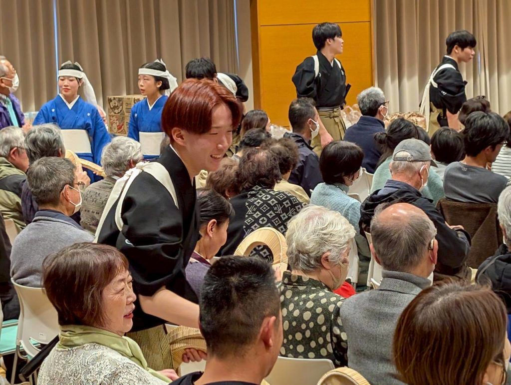 日頃見ることがない、高校生たちの五箇山民謡に皆さんとても喜んでおられました。大きな賞品を抱えて笑顔で帰られる皆さんの姿にこちらも暖かいものを感じました。被災された皆さんの一日でも早い復興を願っています。