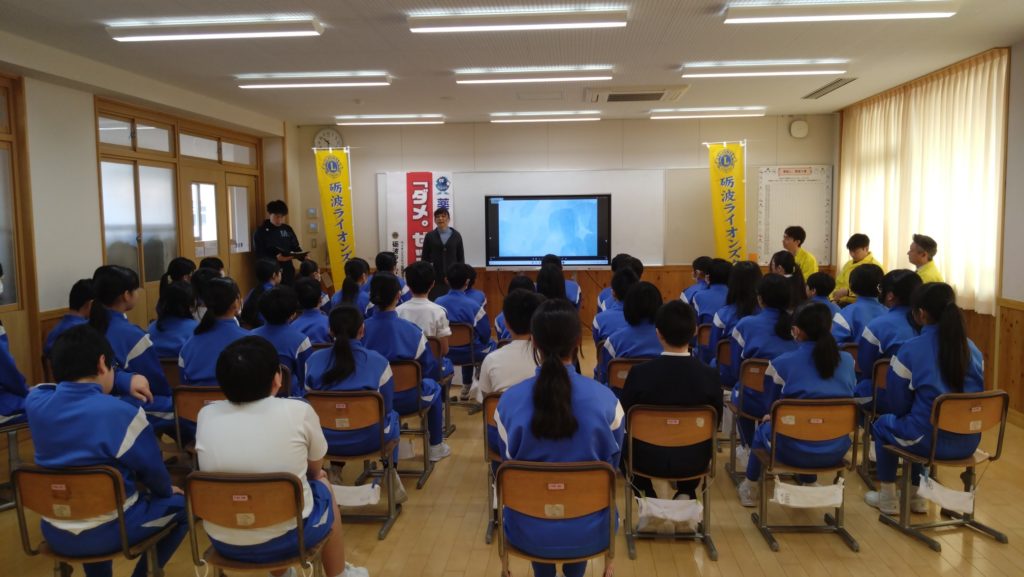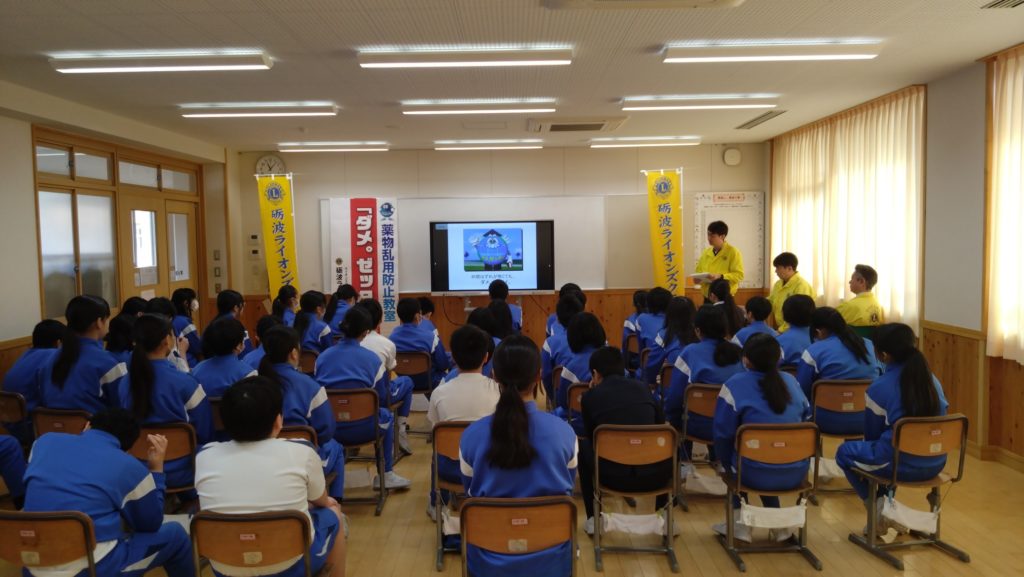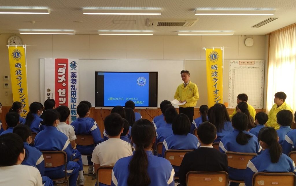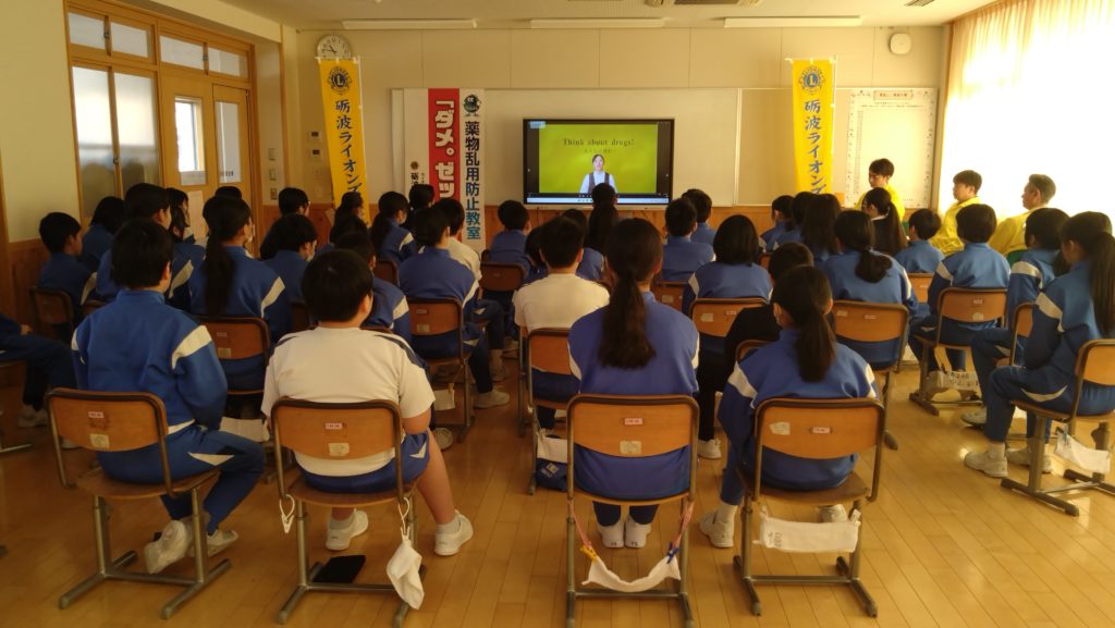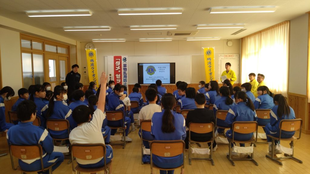 井波小学校の6年生(48名)を対象に、薬物乱用防止教室を開催しました。最初に(公財)麻薬・覚せい剤乱用防止センターで作成されたDVDを視聴してもらい、その後に、当クラブの薬害教育委員長 L.石崎比路が講師となり、パワーポイントを使って講義を行いました。いろいろな情報が溢れている今、子どもたちに命の大切さ、薬物乱用の恐ろしさを伝え、思わぬ危害から身を守れるようにこの授業を通して少しでも薬物乱用防止の大切さが伝わったのであればいいなと思いました。 今回は、講義の前にライオンズクラブについて知ってもらおうと、江上会長がライオンズクラブの活動などを紹介しました。時々、朝のあいさつ運動で学校の玄関前に立っている黄色いジャンパーの人たちは何だろうと思っていたかもしれませんが、ライオンズクラブの活動についても、少しはわかってもらえたのではないでしょうか。