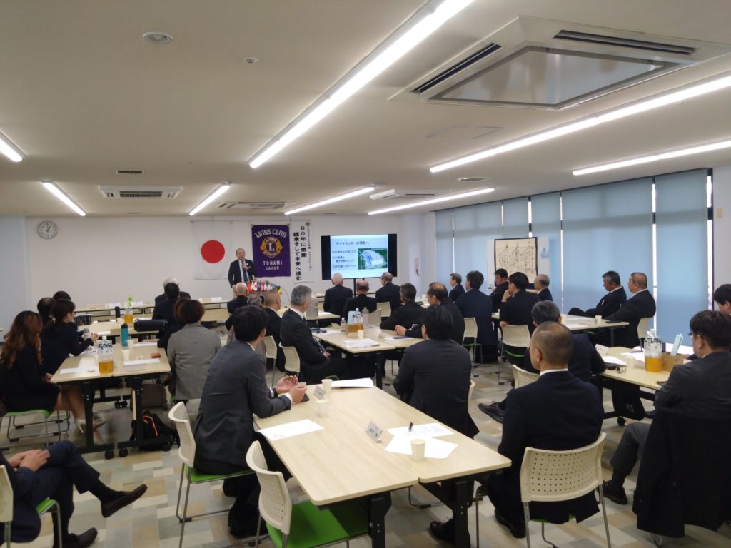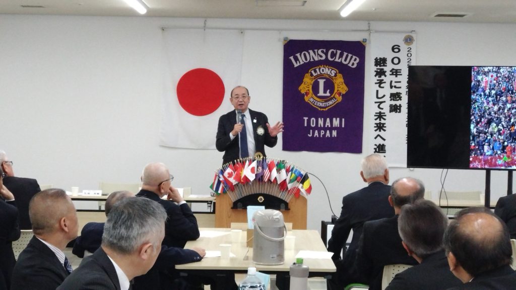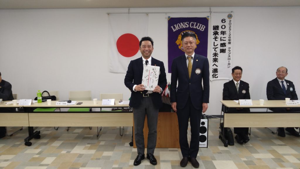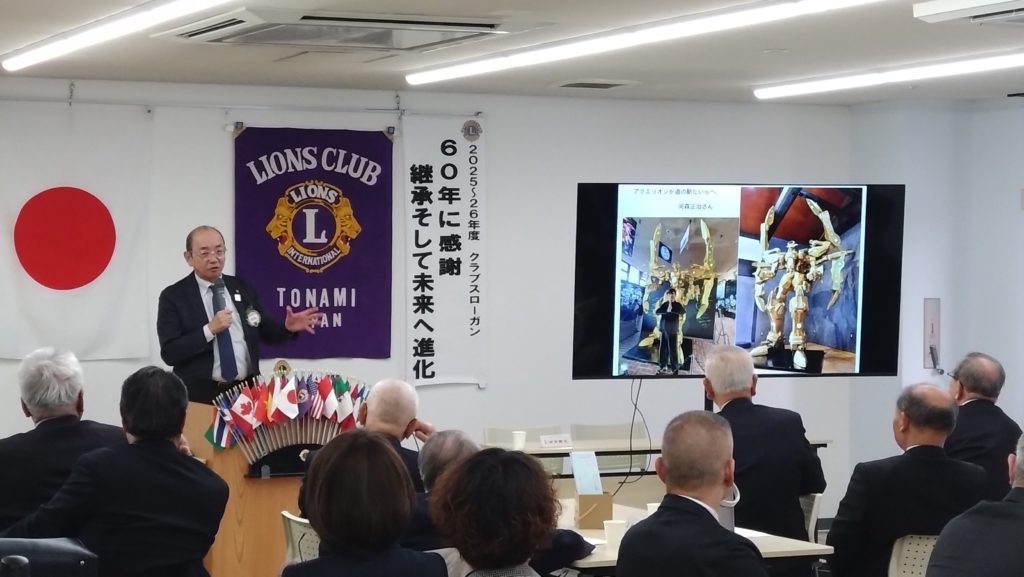 今回の例会は、L.田中幹夫(南砺市長)に会員スピーチをしてもらいました。2月末に平スキー場で開催されたモーグルのワールドカップ2026富山なんと大会、道の駅たいらで公開中のゴールドソーラーアクエリオンの立体像、城端桜ヶ池周辺で造成中のプレイアースパーク、廃棄物からエネルギー実証実験、データセンターの誘致、研究所anto…など、多岐にわたって南砺市がおかれている現況についての話を聞きました。新聞等で何気なく聞いていた情報でしたが、実際に少し踏み込んだ話を聞いてみると、南砺市を取り巻いている環境には、想像をはるかに超えた大きな動きがあるということを知りました。